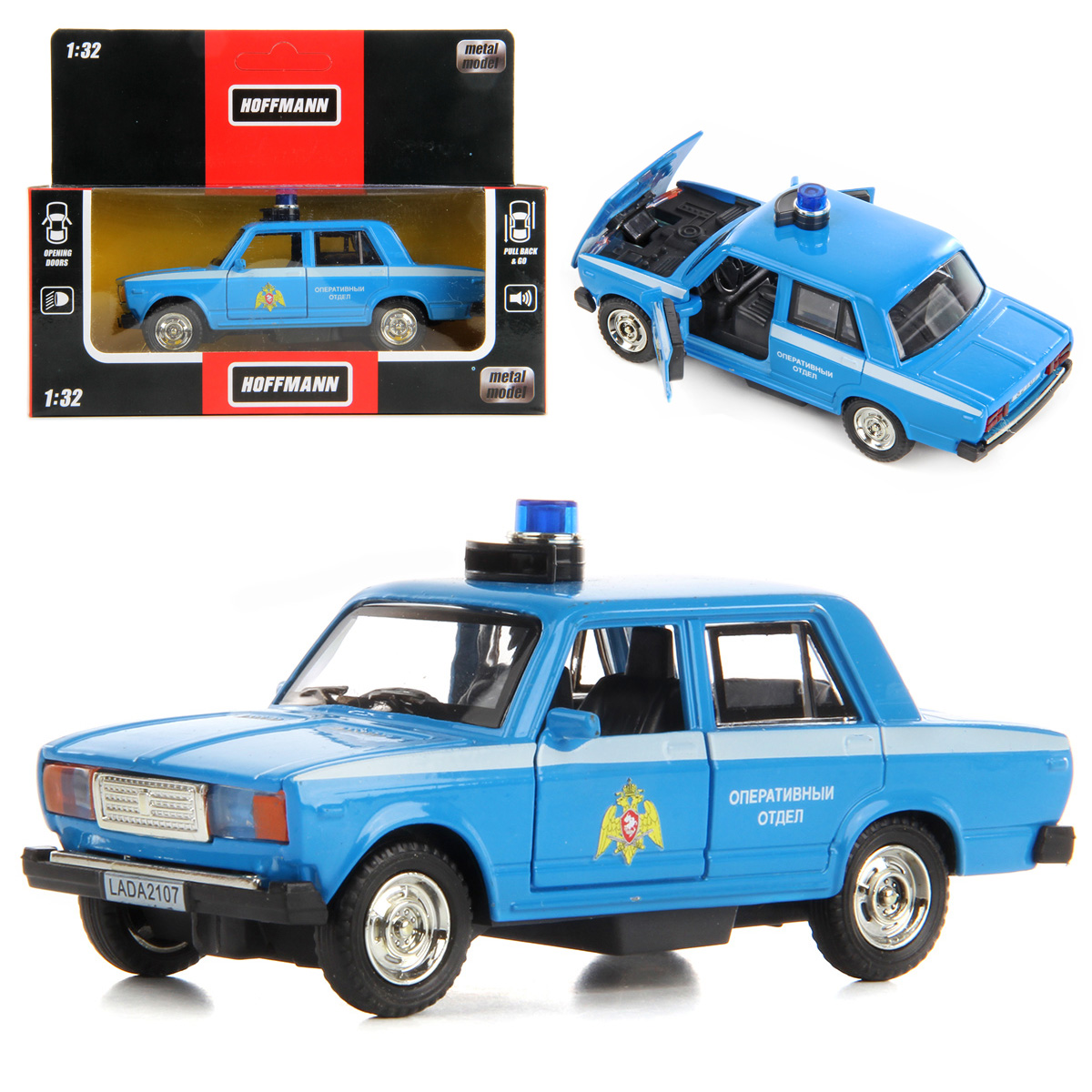 Коллекционные машинки Hoffmann - это высокий уровень проработки игрушки и любовь к деталям. Машинка имеет прорезиненные колеса, снабжена инерционным механизмом и открывающимися дверками салона, ездит вперед-назад. У автомобиля прозрачные стекла, через которые виден весь салон, уровень детализации салона заслуживает высших похвал. Если нажать на корпус машинки, она издаст звук сирены, передние и задние фары станут подсвечиваться. Капот открывается. Благодаря такой машинке ребенок будет с удовольствием играть в сюжетно-ролевые игры, развивая воображение, осваивать новые социальные роли, а еще тренировать координацию движений и ловкость. Соберите всю коллекцию машинок Hoffmann, с которой ребенок проведет множество веселых и увлекательных часов. Машинка работает от 3 батареек LR44, входят в комплект. Игрушка изготовлена из металла. Упакована в коробку с картонным хедером с отверстием. Масштаб машинки 1:32. Размеры автомобиля: 13*5,5*6 см. Размеры коробки: 17*7,5*13,5 см.