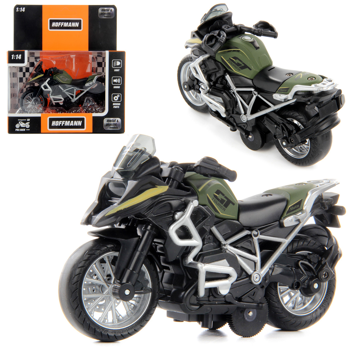 Коллекционные мотоциклы Hoffmann - это высокий уровень проработки игрушки и любовь к деталям. Мотоцикл оснащен инерционным механизмом, прорезиненными колесами, издает звуки заводящегося двигателя, едущего транспорта, торможения, проигрывает мелодию, катается вперед-назад. Фара подсвечивается. Руль с передним колесом поворачивают. Благодаря наличию дополнительных опорных колес мотоцикл сохраняет устойчивое положение. Игрушка изготовлена из износостойких материалов, отличается маневренностью и реалистичным дизайном, масштаб 1:14 позволяет хорошо рассмотреть все детали. С этим мотоциклом ребенок будет с удовольствием играть в сюжетно-ролевые игры, развивая воображение, тренировать координацию движений и мелкую моторику рук. Соберите всю коллекцию мотоциклов Hoffmann, с которой малыш проведет множество веселых и увлекательных часов! Игрушка работает от 3 батареек LR41, входят в комплект. Игрушка изготовлена из металла, есть элементы полимерных материалов. Масштаб 1:14. Размеры игрушки: 12*5*7,5 см. Размеры коробки: 15*8*17 см.
