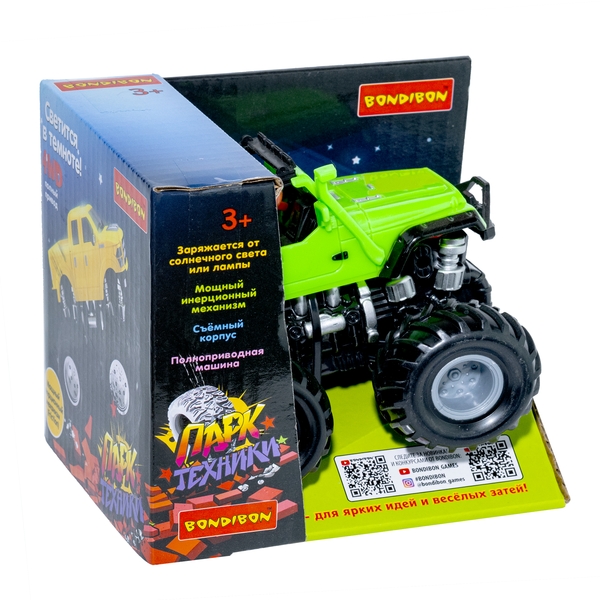 Инерционный джип из серии супер внедорожников «Парк Техники» от Bondibon! Теперь светится в темноте! Маленький, но мощный полноприводный монстр легко покоряет бездорожье. •Огромные колеса с мягкими полыми шинами позволяют преодолевать любые препятствия на пути. Немного подтолкните машинку, и она устремится вперед навстречу приключениям. •За счет мощного инерционного механизма монстр-трек способен двигаться по наклонной поверхности до 30 градусов! А также продолжать движение и вращение даже в вертикальном положении. •Съемный корпус бигфута мягко светится в темноте. Заряжается от солнечного света или лампы. Ребенок сможет воплотить в жизнь любой игровой сюжет, проявляя фантазию. В процессе игры развивается мелкая моторика, пространственное мышление и точность. Игрушка на больших колесах в стильной упаковке – идеальный подарок для мальчиков, обожающих внедорожники! Размер машинки 12*10*10 см \ Материал корпуса - ABS пластик \ Батарейки не требуются \ Цвет зеленый \ Возраст 3+