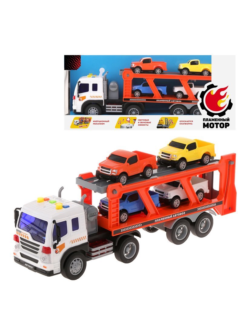 Автовоз инерционный с машинами 4 штуки, свет, звук, в комплекте тестовые элементы питания AG13/LR44*3шт.
