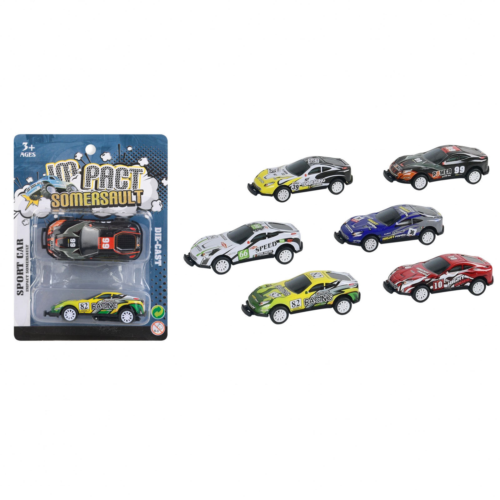 Набор из 2 металлических трюковых машинок-перевертышей. Машинки оснащены инерционным механизмом, а также функцией «сальто». Для исполнения трюка необходимо изменить положение пластины на дне машинки, зафиксировать ее, оттянуть машинку назад и отпустить. Машинка сделает сальто, столкнувшись с препятствием. Корпус машинок выполнен из металлического сплава. Размер машинки: 7,8*3,5*2,3 см. 6 цветов в ассортименте.