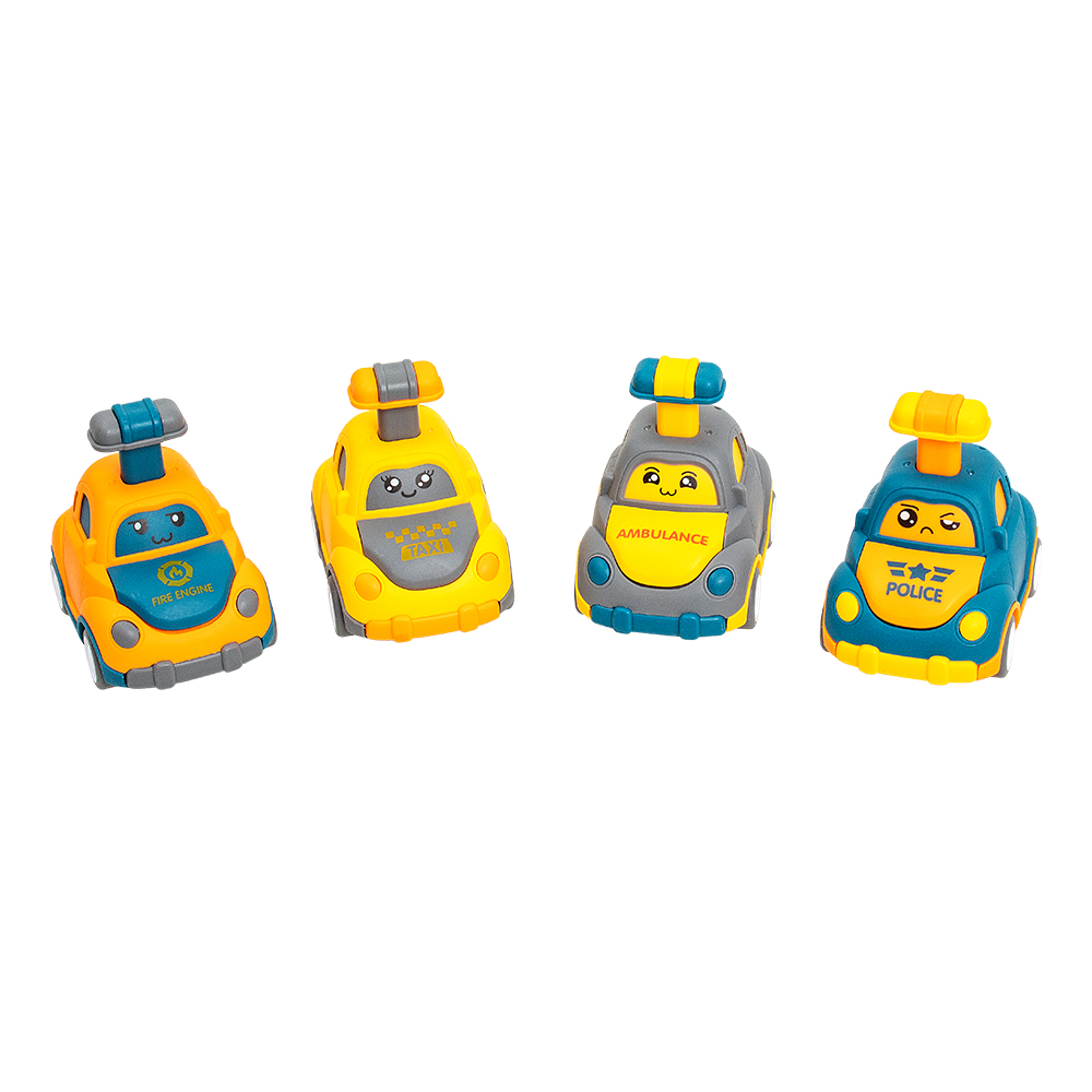 Машинка инерционная с кнопкой запуска. Игрушка оснащена инерционным механизмом «нажми – поедет», который запускается нажатием кнопки на крыше машинки. У машинки открывается капот. В ассортименте 4 цвета: скорая помощь, полиция, пожарная машинка и такси. Размер машинки: 9,3*6,1*8,5 см. Поставка в дисплее по 12 шт. Размер дисплея: 24,5*28,5*8,6 см.