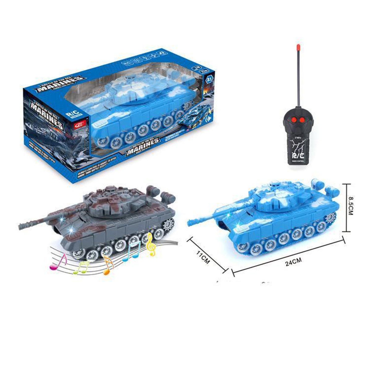 Танк на пульте управления со световыми и звуковыми эффектами. В комплект входит пульт, танк. Пульт работает на батарейках АА 2 шт., не входят в комплект, танк работает на батарейках АА 3 шт., не входят в комплект. Функционал игрушки: -при включении танк издаёт звуки боя, загораются фары; -башня поворачивается, пушка опускается и поднимается; -танк ездит вперёд назад; -частота работы 2.7 MHz. Размеры упаковки: 28*12*11 см. Размеры танка: 24*10*8 см. Размеры пульта: 10*5*4 см. Изготовлено из пластика.
