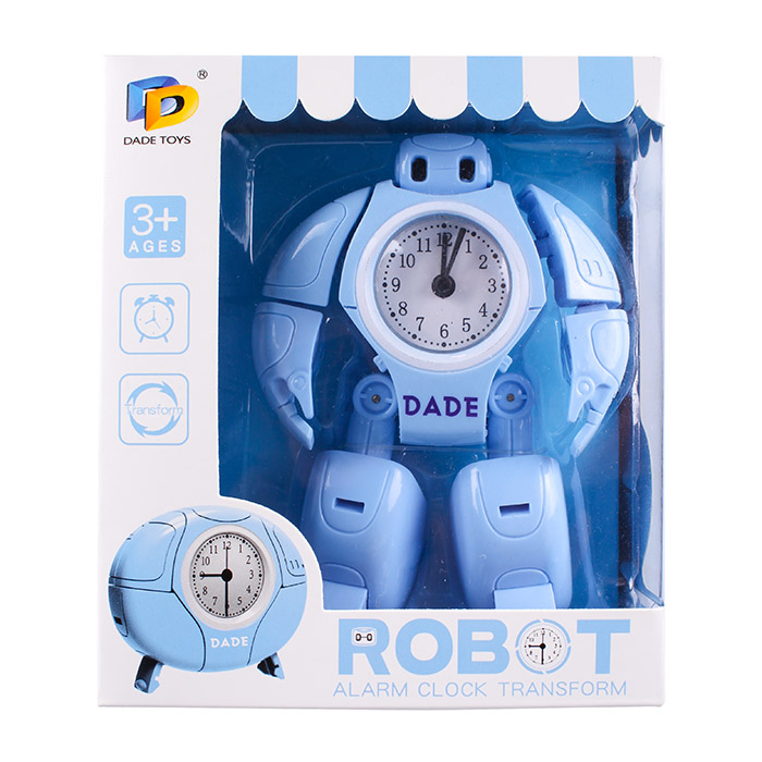 Трансформер Робот - часы. Выполняет функцию игрушки-Робота, который трансформируется в часики-будильник. Использовать батареи LR44*2шт( в комплект входят). Упаковка - картонная коробка 13*15*8 см.