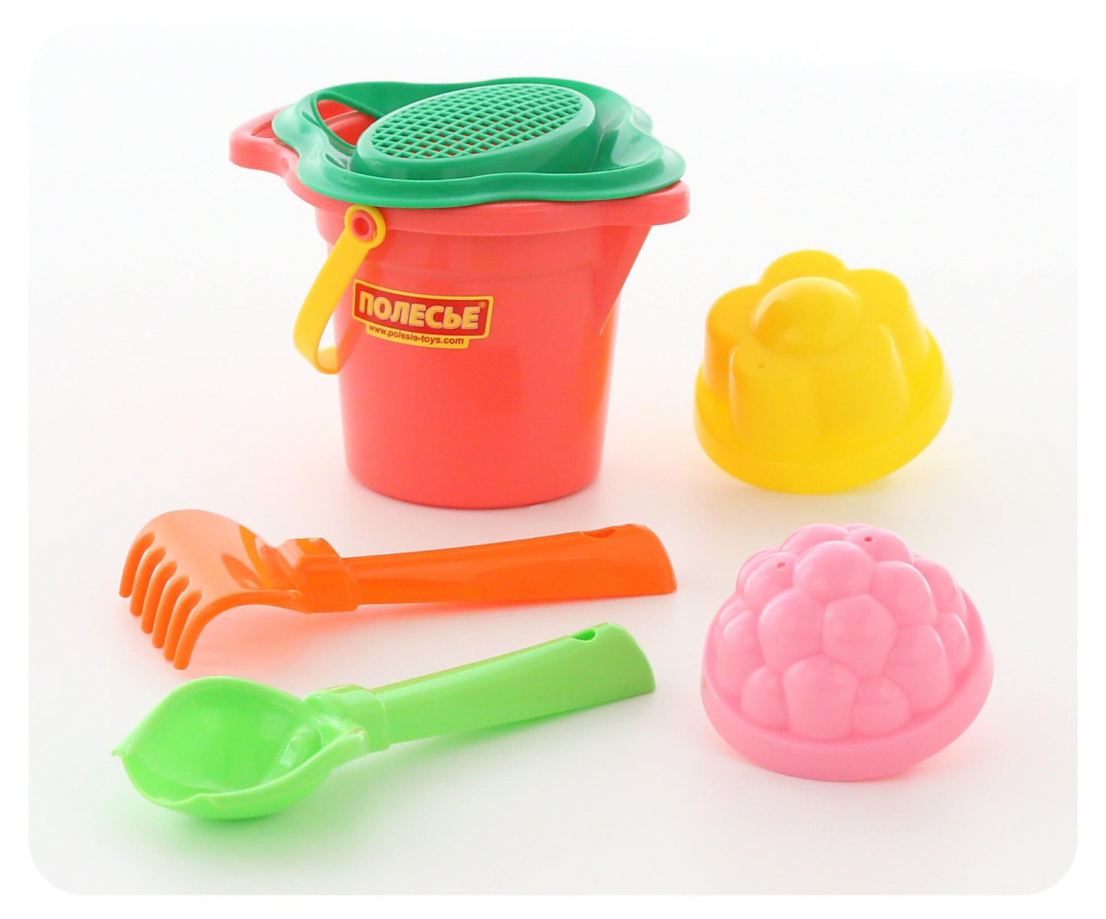 Набор №150: ведро малое с носиком, ситечко-цветок, совок №2, грабельки №2, 2 формочки