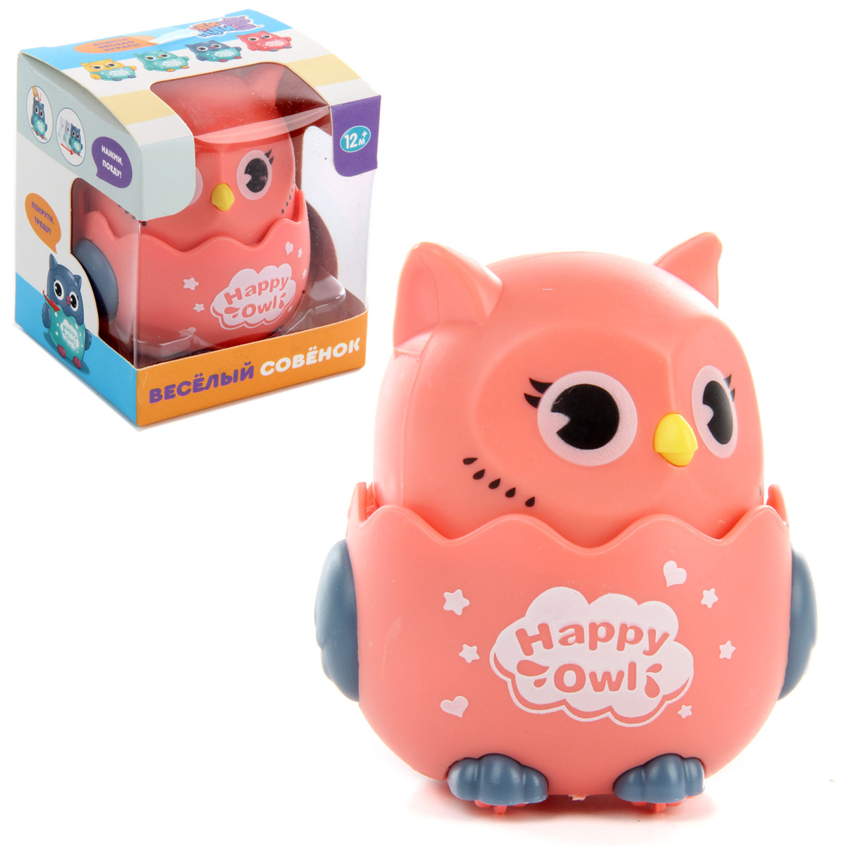 Потрясающая игрушка, которая обязательно понравится каждому малышу - веселый совенок. Принцип работы: - нажмите на голову игрушки; - она поедет вперед; - если покрутить голову совенка, он издаст потрескивающий звук. Благодаря такой игрушке ребенок будет с удовольствием развивать мелкую моторику рук, координацию движений, воображение, зрительное и слуховое восприятие. Игрушка предназначена для детей до 3 лет. Игрушка изготовлена из качественного и безопасного полимерного материала. Размеры игрушки: 7*6*8 см. Размеры коробки: 7*7*8 см.