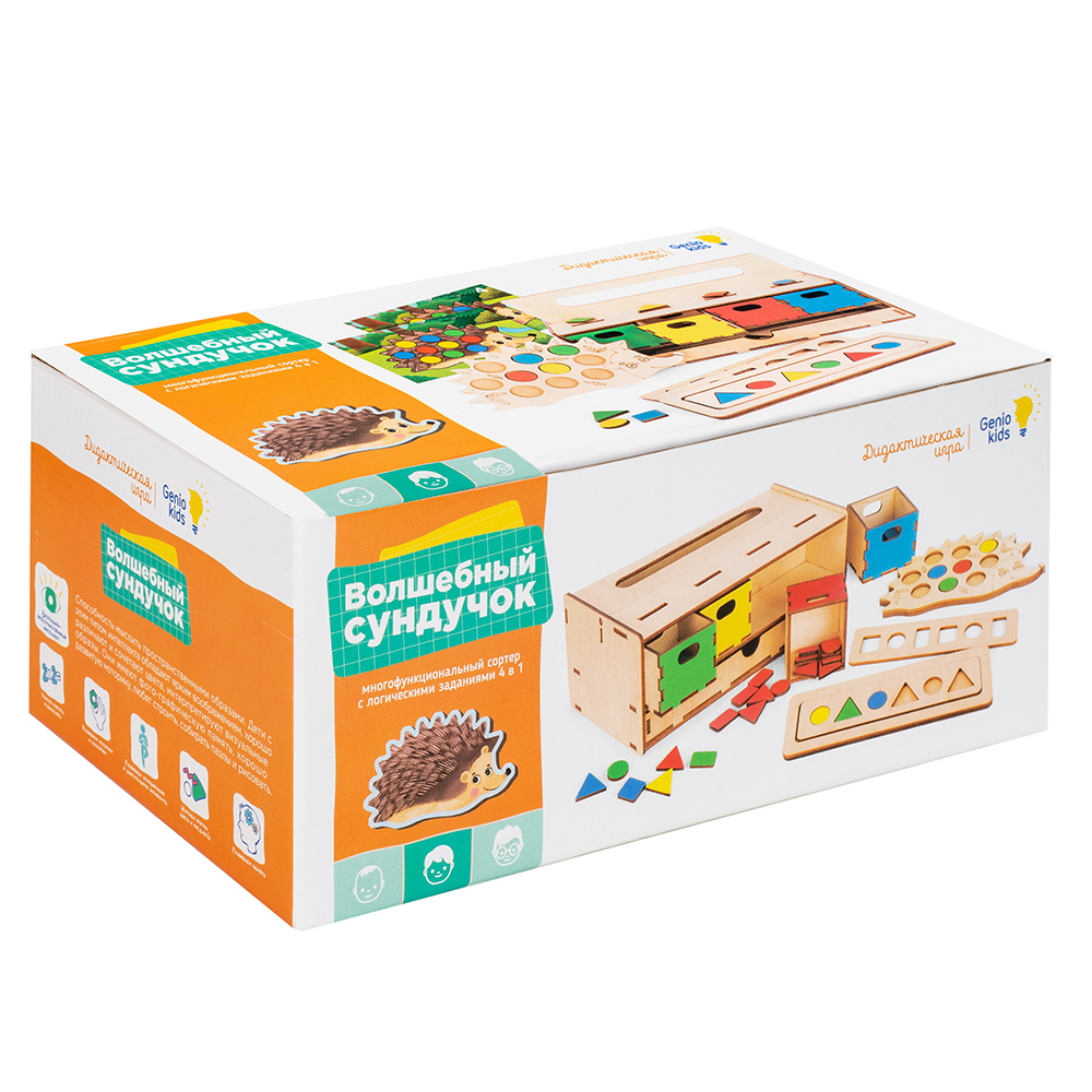 Волшебный сундучок – это многофункциональный тренажер, который включает в себя 4 игры. В игровой форме ребенок изучает цвета и геометрические формы, складывая фигурки в специальные панели или сортируя их по цвету в разноцветные ящички. Игра сортер-ежик познакомит ребенка с простым счетом от 1 до 10 и научит складывать элементы по образцу на картинке, что тренирует визуальное восприятие и память. Геометрические фигурки – замечательный счетный материал. Элементы сортера можно также использовать в качестве трафаретов, которые развивают мелкую моторику и готовят руку к письму.