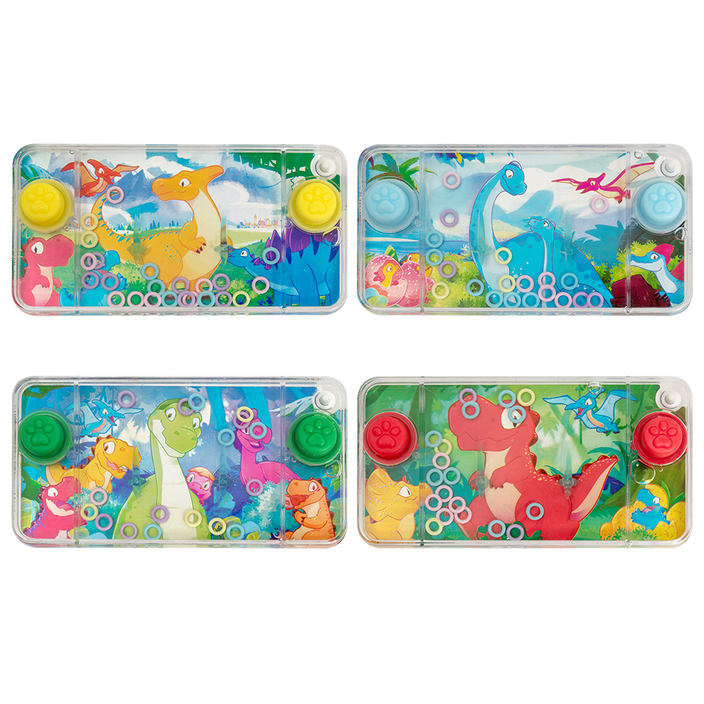 Классическая дорожная игра имеет две кнопки, нажатием которых плавающие в жидкости колечки подбрасываются вверх. Цель игры – забросить все колечки на 2 палочки. Благодаря компактному размеру игрушку удобно брать с собой, она отлично подойдет для того, чтобы занять ребенка в дороге или отвлечь от гаджетов. Яркий привлекательный дизайн с изображением динозавров понравится любому ребенку. Размер игрушки: 11,5*6*2 см. 4 цвета в ассортименте.