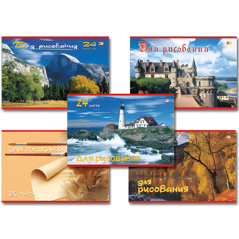 Серия альбомов для рисования «Пейзажи» с ярким и разнообразным оформлением обложки. Альбом А4 формата, на скобе. Внутренний блок - 24 листа, офсетная бумага 100 г/м2. Обложка изготовлена из плотной офсетной бумаги 120 г/м2. Поставляется в 5 вариантах дизайна без возможности выбора.Это товар эконом-сегмента, поэтому он отличается привлекательной ценой. Товар обладает базовым набором характеристик и простой упаковкой, при этом полностью соответствует основным требованиям потребителей.