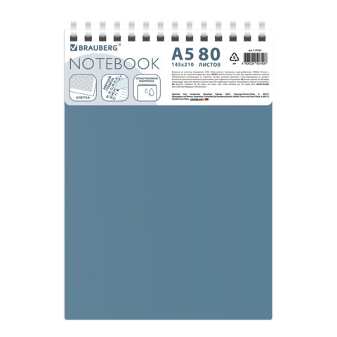Блокнот А5, 80 л., силиконовый гребень, обложка пластик, клетка, BRAUBERG, синий, 117561