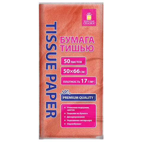 Цветная бумага ТИШЬЮ 17 г/м2, 50х66 см, 50 листов, коралловый цвет, ЗОЛОТАЯ СКАЗКА, 116485