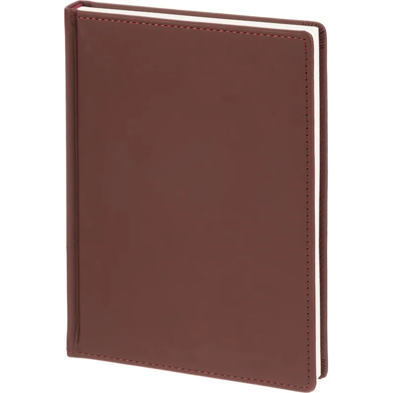Ежедневник недатированный Attache Velvet искусственная кожа Soft Touch A5+ 136 листов бордовый Ежедневник с твёрдой обложкой из искусственной кожи бордового цвета, выполненной с рельефом, имитирующим текстуру натуральной кожи, защищает внутренний блок от повреждений. Обложка украшена аккуратной строчкой, подчёркивающей её изящные скруглённые уголки. Внутренний блок на 272 страницы состоит из белой офсетной бумаги плотностью 90 г/кв.м. с линовкой в линейку и почасовой разметкой, что позволяет удобно планировать день. Размер ежедневника — 14.6?20.6 см. Он оснащён дополнительным справочным разделом на 14 страницах и телефонной книгой на 18 страницах для записи личных и деловых контактов. Ежедневник идеально подходит для персонализации, что делает его отличным выбором для деловых встреч и корпоративных нужд. Тип крепления блока — сшивка.