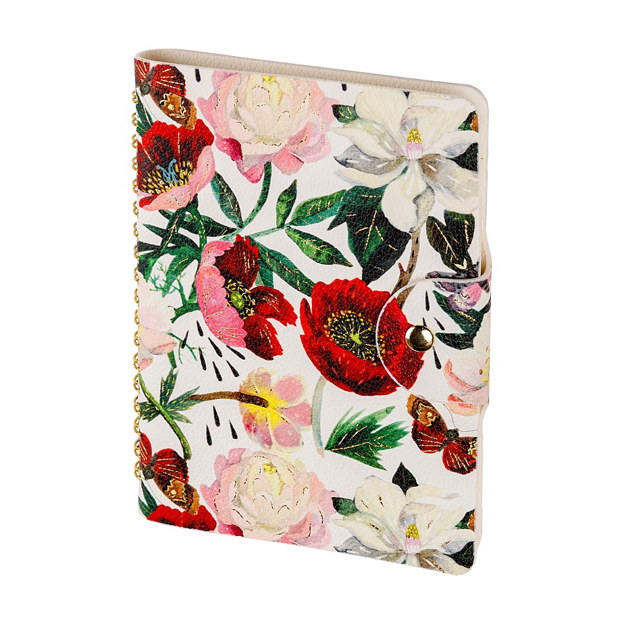 Недатированный ежедневник «FLORA.Пионы» от Bruno Visconti формата B6 – идеальное решение для динамичных деловых людей, которым важны комфорт и мобильность. Гибкая (flex) обложка из необычайно мягкой и фактурной искусственной кожи, скругленный угол обложки и блока, полускрытый гребень, позволяющий держать ежедневник открытым на столе и работать с комфортом, делая записи, фиксирующий хлястик на кнопке - все это визитная карточка ежедневника «FLORA.Пионы». Внутренний блок ежедневника изготовлен из высококачественной бежевой бумаги, обладающей плотностью 70 грамм и содержит 272 страницы.