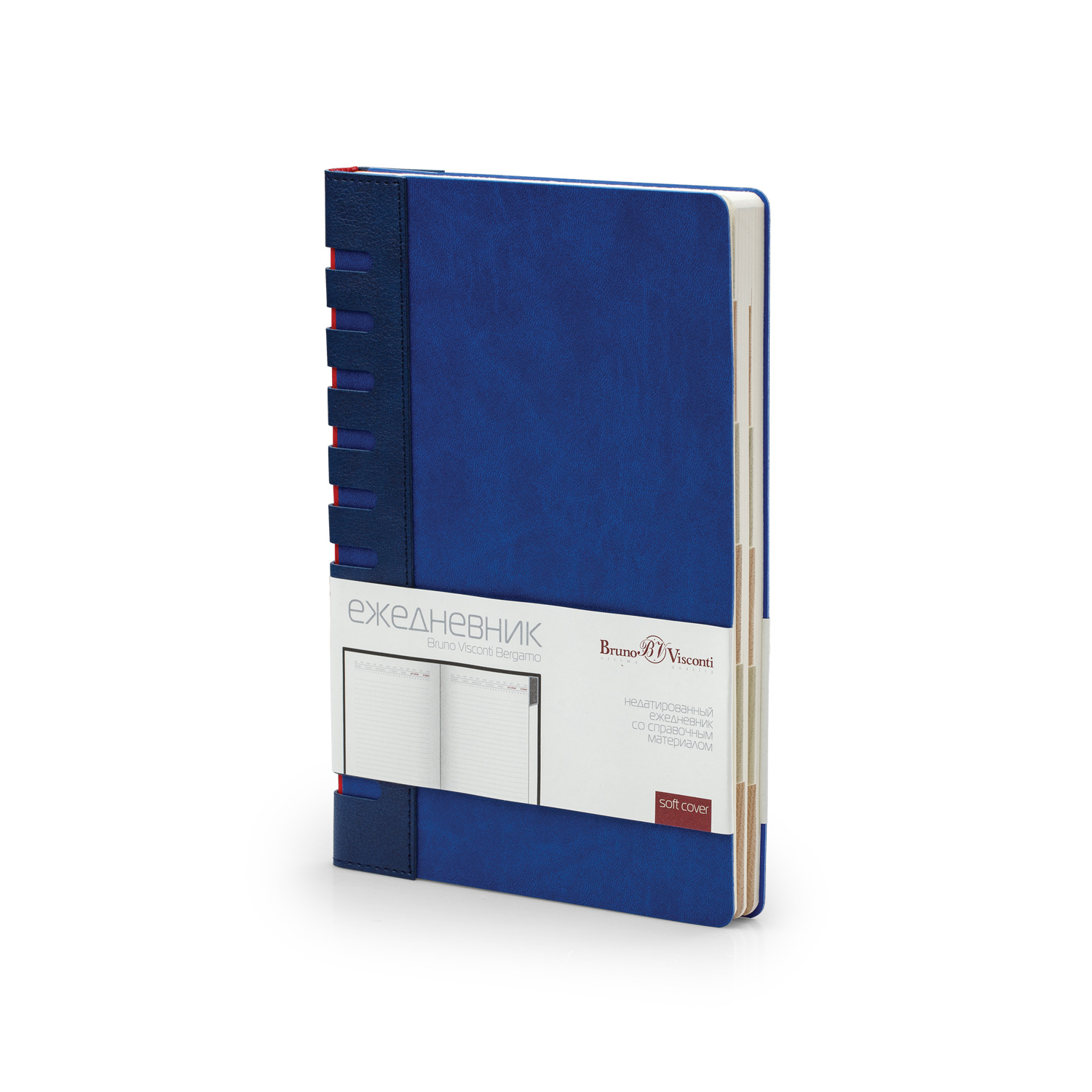 Недатированный ежедневник «BERGAMO» от Bruno Visconti формата А5 из высококачественной экокожи - стильный и современный деловой аксессуар для планирования рабочего времени и ведения записей. Ежедневник отличается оригинальным исполнением: гибкая обложка с контрастной нашивкой и фигурной вырубкой по торцу ежедневника. Еще одна его особенность - дополнительная функциональность: вырубные индексы с цветной маркировкой, разбивающие блок на месяцы (вырубки по месяцам) для удобного планирования. Внутренний блок изготовлен из бежевой бумаги плотностью 70 г/кв.м и напечатан в 2 цвета. В начале ежедневника присутствует справочная информация (часовые пояса, аэропорты Европы, расход калорий при физической нагрузке, размеры одежды, полезные сайты для путешественников, время распада алкоголя, допустимый уровень содержания алкоголя в крови при вождении, греческие буквы, термины международной торговли, а также города-миллионники РФ и СНГ).