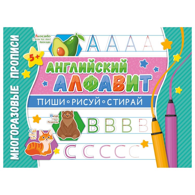 Многоразовые прописи для детей 5 лет – популярный формат обучающих занятий для подготовки к школе. В отличие от бумажных прописей многоразовые напоминают игру: каждая страница украшена яркими иллюстрациями животных и предметов, а буквы нужно обводить фломастерами на водной основе и стирать салфеткой, если ребенок допустил ошибку. Специальное покрытие позволяет использовать прописи не один раз. В тетради «Английский алфавит» собрано 10 страниц с полезными заданиями, которые помогут ребенку выучить 26 букв английского алфавита, развить внимание и аккуратность. С помощью многоразовых прописей дошкольники подготовят руку к письму и научатся работать по образцу. Развивающая книга формата 290х210 мм отпечатана на мелованной бумаге.