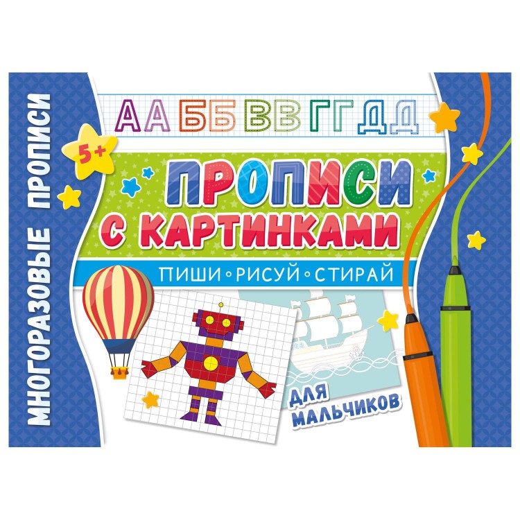 Многоразовые прописи для детей 5 лет – популярный формат обучающих занятий для подготовки к школе. В отличие от бумажных прописей многоразовые напоминают игру: на каждой странице представлены различные виды транспорта и необычные герои. Буквы, цифры и рисунки нужно обводить фломастерами на водной основе и стирать салфеткой, если ребенок допустил ошибку. Специальное покрытие позволяет использовать прописи не один раз. В тетради «Прописи с картинками для мальчиков» собрано 10 страниц с полезными заданиями: обведи буквы и цифры, перерисуй картинку по клеточкам и обведи рисунки по пунктиру. Прописи помогут ребенку познакомиться с буквами и цифрами, развить внимание и аккуратность. С помощью многоразовых прописей дошкольники подготовят руку к письму и научатся работать по образцу. Развивающая книга формата 290х210 мм отпечатана на мелованной бумаге.
