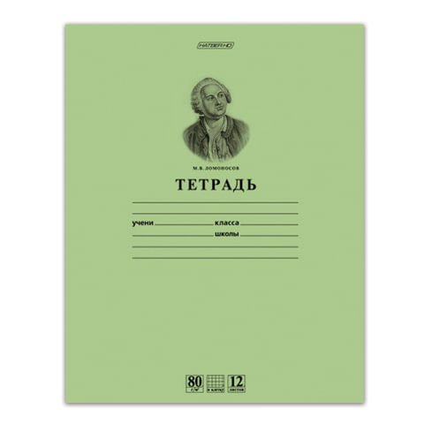 Тетрадь HATBER с классической зеленой обложкой и изображением М.В. Ломоносова для дошкольников и учащихся начальных и средних классов. Внутренний блок из офсетной бумаги повышенной плотности 80 г/м2 обеспечивает наилучшее удобство письма и содержит 12 листов в клетку с полями. Обложка изготовлена из плотной тонированной бумаги. Скрепка надежно скрепляет листы между собой.