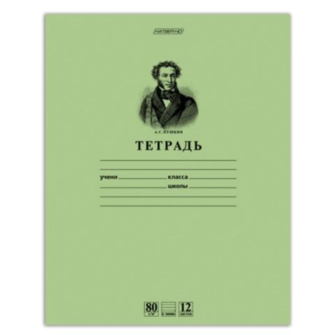 Тетрадь HATBER с классической зеленой обложкой и изображением А.С. Пушкина для дошкольников и учащихся начальных и средних классов. Внутренний блок из офсетной бумаги повышенной плотности 80 г/м2 обеспечивает наилучшее удобство письма и содержит 12 листов в линию с полями. Обложка изготовлена из плотной тонированной бумаги. Скрепка надежно скрепляет листы между собой.