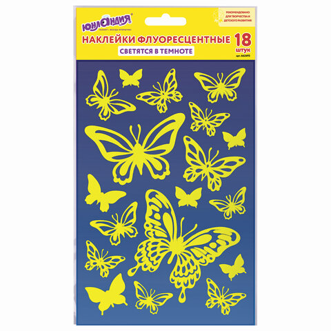 Наклейки флуоресцентные "Бабочки", светятся в темноте, 18 штук, ассорти, 14х21 см, ЮНЛАНДИЯ, 662693