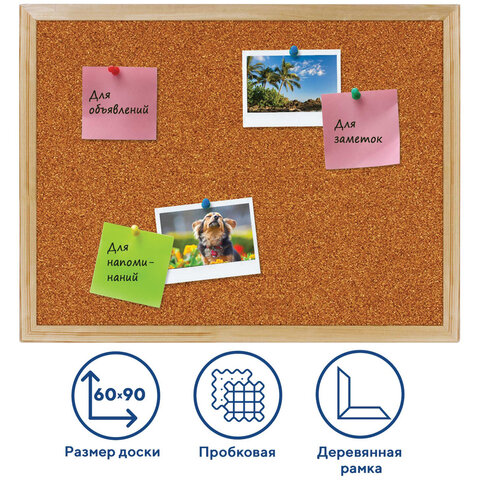 Доска пробковая для объявлений (60х90 см), деревянная рамка, ГАРАНТИЯ 10 ЛЕТ, РОССИЯ, BRAUBERG, 236860