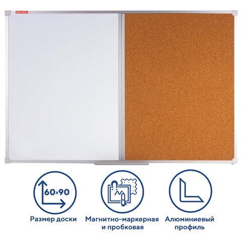 Доска комбинированная: магнитно-маркерная, пробковая для объявлений 60х90 см, РОССИЯ, BRAUBERG, 236864