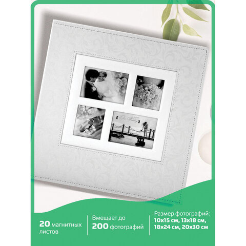 Свадебный фотоальбом BRAUBERG бережно позаботится о фотографиях, а также станет неповторимым и приятным подарком для сохранения самых лучших моментов такого события. Состоит из 20 магнитных листов размером 30х32 см, что позволяет комбинировать и размещать до 200 фотографий различных форматов: 18х24 см, 20х30 см, 10х15 см, 13х18 см. Обложка альбома белого цвета стилизована под фактурную кожу и декорирована 4-мя рамками, фотографии в которых могут быть заменены по желанию владельца. Фотоальбом на кольцах отличается повышенной прочностью и долгим сроком службы. Размер - 33,5х34,5 см. Размеры окошек под фото - 9х6,5 см; 5,5х6,5; 5,5х8; 9х8 см.