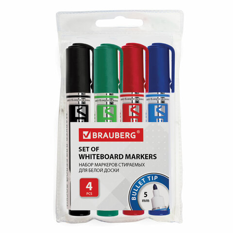 Высококачественный набор маркеров BRAUBERG "NEO" для белой доски. Предназначен для письма на досках с магнитно-маркерной поверхностью. 4 цвета в наборе: черный, красный, синий, зеленый. Круглый пластиковый корпус имеет диаметр 19 мм. Наконечник круглой формы обеспечивает толщину линии письма 5 мм, что позволяет писать крупным шрифтом, который будет хорошо виден. Благодаря спиртовой основе чернила быстро высыхают и не оставляют разводов, легко стираются сухой губкой. Изделие не перезаправляется. Цвет колпачка соответствует цвету чернил.