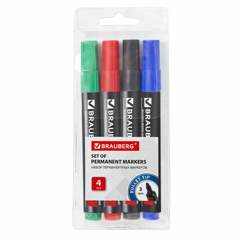 Маркеры перманентные (нестираемые) BRAUBERG, НАБОР 4 шт., АССОРТИ, "Contract", без клипа, круглые 3 мм, 150474