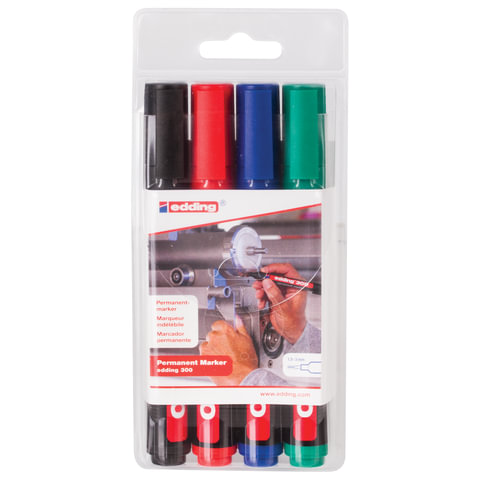 Набор EDDING "300" содержит 4 высококачественных перманентных маркера, подходит для использования на любых поверхностях и под любым углом. Применяется в самых разных отраслях, отлично подходит для долговечной маркировки. Маркер заправлен перманентными нетоксичными водостойкими и светостойкими чернилами на спиртовой основе, которые не подвергаются воздействию низких и высоких температур. Поставляется в круглом корпусе диаметром 15 мм с деталями в цвет чернил. Толщина проводимой линии письма 1,5 - 3 мм в зависимости от нажима, форма наконечника - круглая. Хранить с плотно закрытым колпачком в горизонтальном положении.