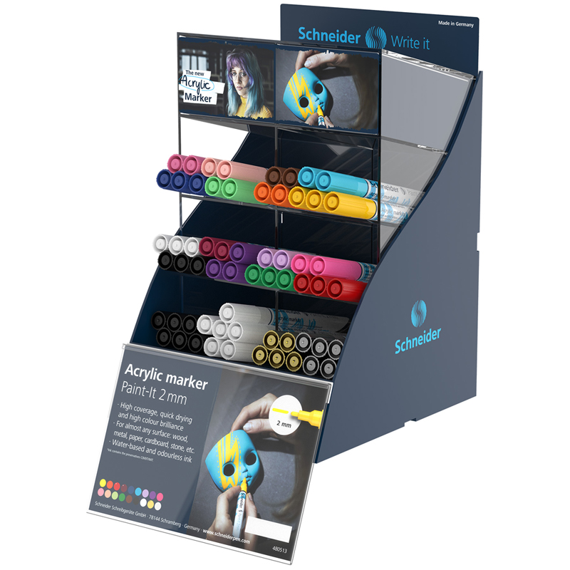 Schneider Paint-It 310 - акриловый маркер для творчества и хобби. Толщина линии – 2 мм, форма наконечника – пулевидная. Акриловые чернила на водной основе быстро сохнут, обеспечивают интенсивность цвета, высокие укрывные свойства и стойкость после высыхания. Не содержат ксилол и толуол. Подходит для работ на различных поверхностях: бумага, дерево, камень, гипс и т.д. Перед использованием маркер необходимо встряхнуть для смешивания и равномерной подачи чернил. Пластиковый дисплей содержит 61 акриловый маркер.• Цвет чернил: ассорти, • Толщина линии письма: 2 мм, • Страна производства: Германия