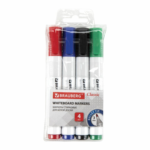 Набор маркеров BRAUBERG "CLASSIC" предназначен для использования на белых досках с магнитно-маркерной поверхностью. Идеально подходит для проведения презентаций, совещаний, уроков. 4 цвета в наборе: черный, красный, синий, зеленый. Круглый пластиковый корпус имеет диаметр 15 мм. Наконечник круглой формы обеспечивает толщину линии письма 3 мм, что позволяет писать крупным шрифтом, который будет хорошо виден. Основа чернил - спиртовая. Чернила быстро высыхают и не оставляют разводов, легко стираются сухой губкой. Изделие не перезаправляется. Цвет колпачка и клипа соответствует цвету чернил.