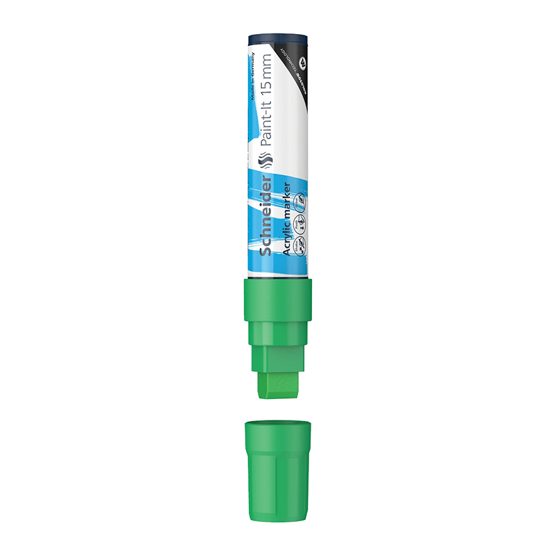 Schneider Paint-It 330 - акриловый маркер для творчества и хобби. Толщина линии – 15 мм, форма наконечника – прямоугольная, цвет чернил - зеленый. Акриловые чернила на водной основе быстро сохнут, обеспечивают интенсивность цвета, высокие укрывные свойства и стойкость после высыхания. Не содержат ксилол и толуол. Подходит для работ на различных поверхностях: бумага, дерево, камень, гипс и т.д. Перед использованием маркер необходимо встряхнуть для смешивания и равномерной подачи чернил. • Цвет чернил: зеленый, • Толщина линии письма: 15 мм, • Страна производства: Германия