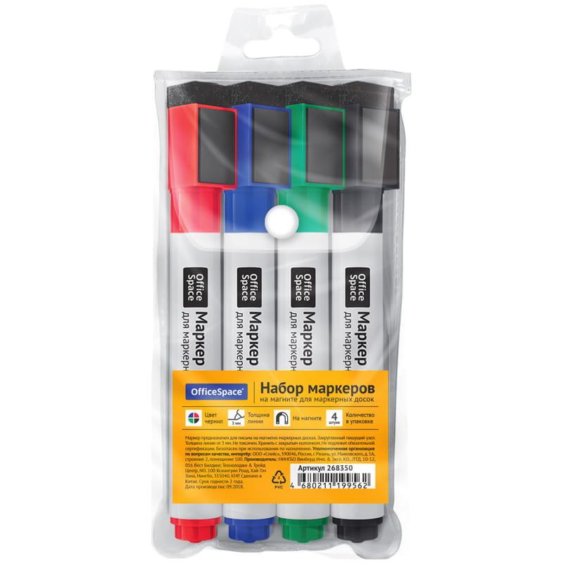 Набор маркеров для белых досок на магнитах OfficeSpace, 4цв., пулевидный, 3мм, чехол с европодвесом. 268350