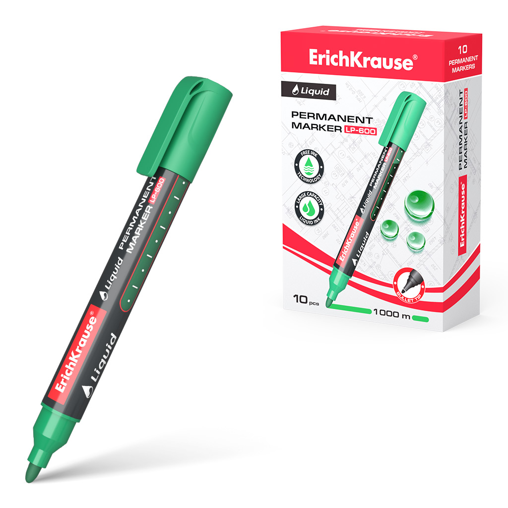 Перманентный маркер с жидкими чернилами Erich Krause® Liquid LP-600, цвет чернил зеленый (в коробке по 10 штук)