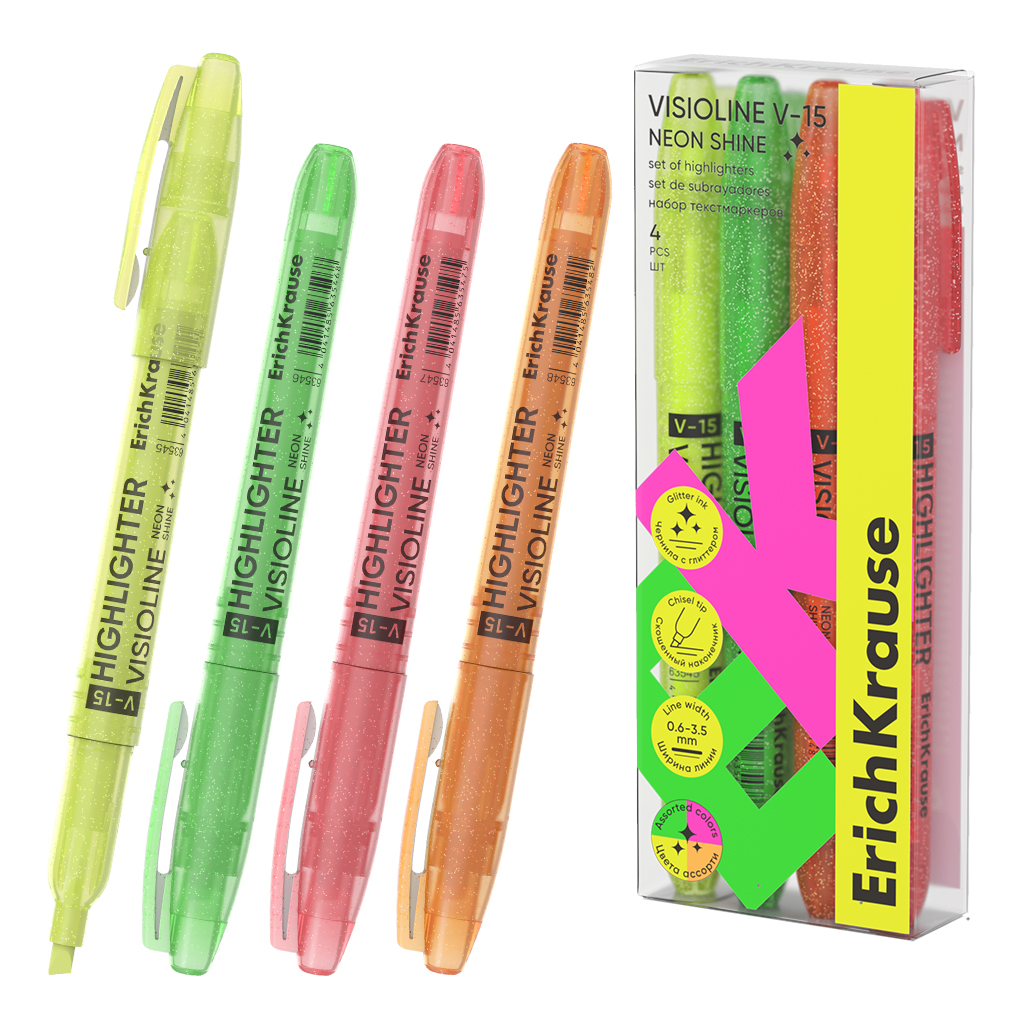 Набор из 4 текстмаркеров ErichKrause Visioline V-15 Neon Shine, цвет чернил ассорти (в пэт-боксе)
