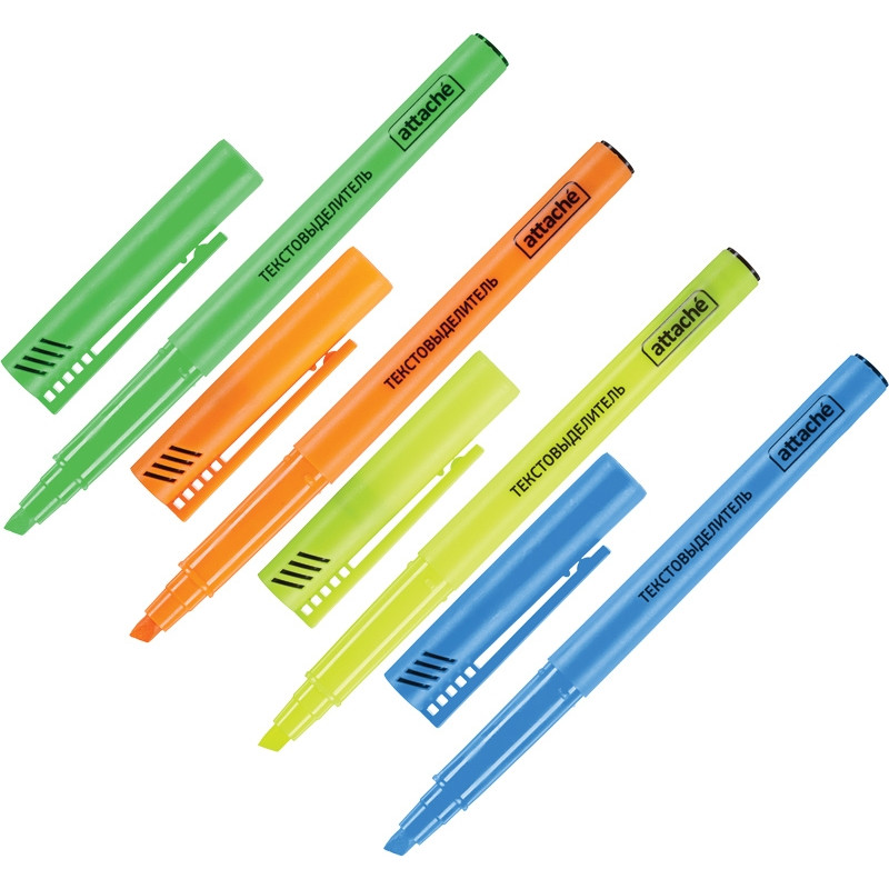 Набор текстовыделителей Attache в прозрачной упаковке. Скошенный наконечник обеспечивает толщину линии письма от 1 до 3 мм. Светостойкие чернила позволяют использовать текстовыделитель на бумаге любой плотности. Колпачок снабжен специальным зажимом, с помощью которого можно прикрепить маркер к любой обложке. В наборе 4 цвета: оранжевый, желтый, зеленый, синий.