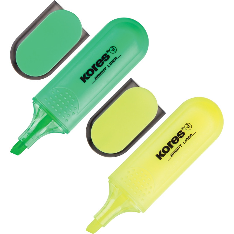 Набор текстовыделителей Kores в прозрачной упаковке. Эргономичный корпус выполнен из пластика. Скошенный наконечник, устойчивый к высыханию, обеспечивает толщину линии письма от 0,5 до 5 мм. Светостойкие чернила желтого и зеленого цвета на водной основе позволяют использовать текстовыделитель на различных типах бумаги. В наборе 2 цвета: желтый и зеленый.