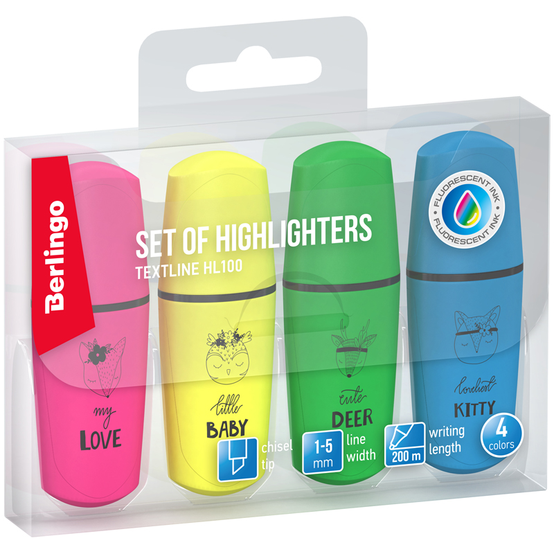 Набор текстовыделителей "Berlingo", 4 цвета,предназначены для маркировки текста на всех типах бумаги. Мини-текстовыделители с флуоресцентными чернилами на водной основе. Изготовлены в компактных пластиковых корпусах без клипов с изящными рисунками на корпусе в цвет чернил. Длина непрерывной линии письма до 200 метров. Толщина линии письма от 1 до 5 мм. Упакованы в PET пенал с европодвесом
