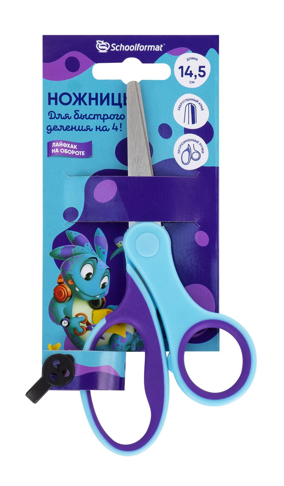 Ножницы школьные Schoolformat безопасные 145 мм эргоном. ручки пластиковые с резин. вставками голуб., фиолетов.