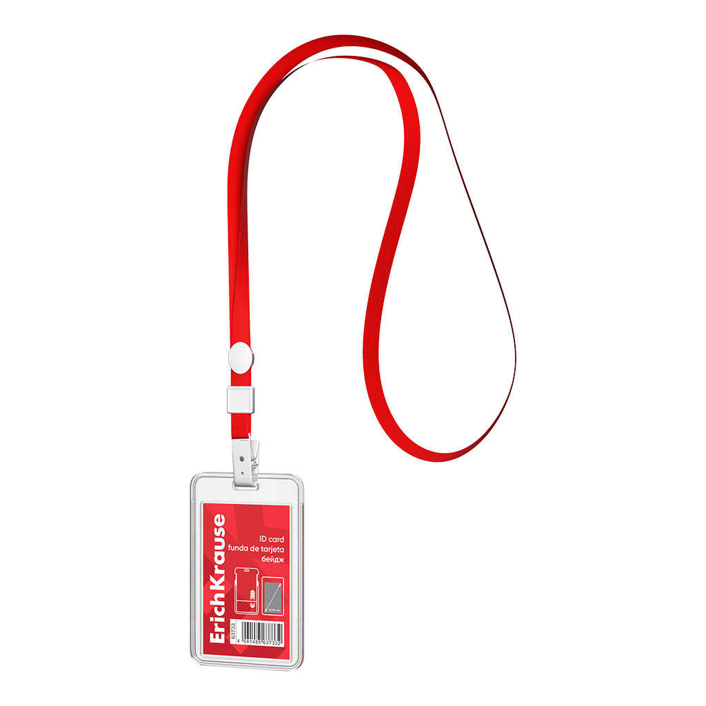 Бейдж вертикальный в комплекте с лентой ErichKrause слайдер, размер вставки 54х85 мм, прозрачный, цвет ленты красный (в пакете)