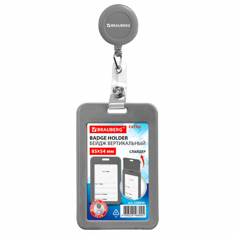 Бейдж вертикальный (85х54 мм), с рулеткой 70 см с клипом, СЛАЙДЕР, серый, BRAUBERG EXTRA, 238846