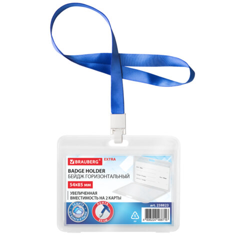 Бейдж горизонтальный (54х85мм) на 2 карты с лентой 45 см ЗАЩИТА ОТ ВЛАГИ И ПЫЛИ, BRAUBERG EXTRA, 238823