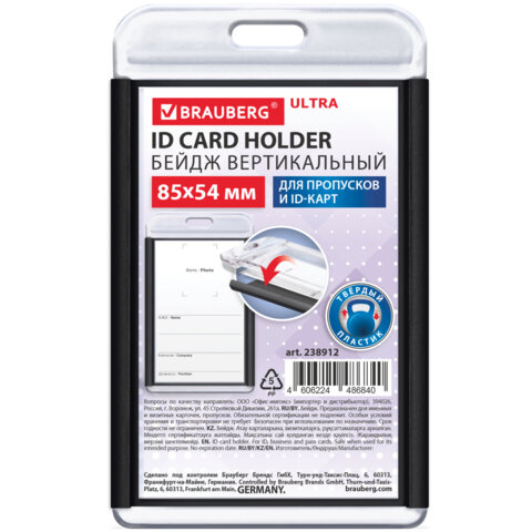Бейдж вертикальный для пропуска и ID-карт, 85х54 мм, черный, BRAUBERG ULTRA, 238912