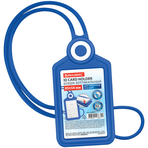 Бейдж вертикальный для пропуска и ID-карт, СИЛИКОНОВЫЙ, 85х54 мм, шнурок 42 см, синий, BRAUBERG, 238902