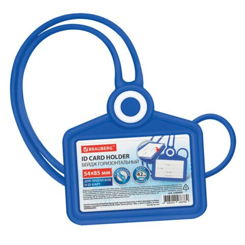 Бейдж горизонтальный для пропуска и ID-карт, СИЛИКОНОВЫЙ, 54х85 мм, шнурок 42 см, синий, BRAUBERG, 238906