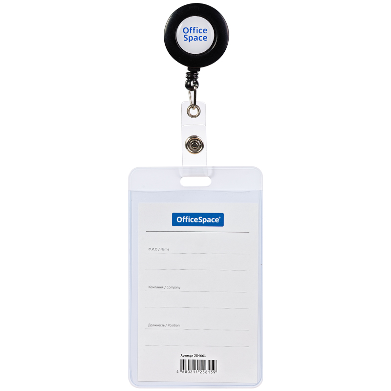 Бейдж вертикальный OfficeSpace, 68*110мм (размер вставки 60*90мм), держатель-рулетка, черный