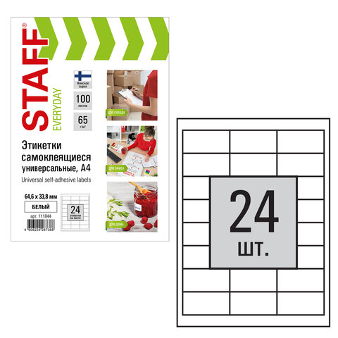 Этикетка самоклеящаяся 64,6х33,8 мм, 24 этикетки 65 г/м2, 100 л., STAFF "Everyday" (сырье Финляндия), 111844