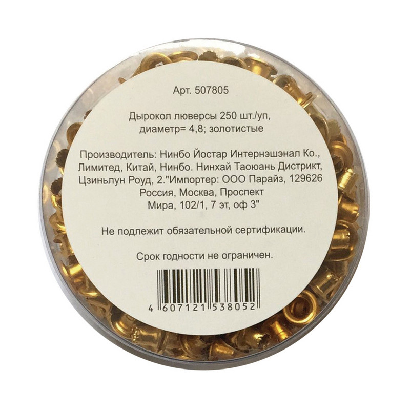 Комплект люверсов для дырокола выполнены из металла золотистого цвета. Диаметр люверса - 4,8 мм. В упаковке содержится 250 штук.