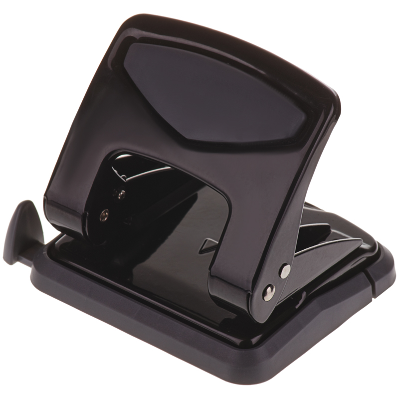 Металлический дырокол, пробивная мощность 35 листов. Дырокол снабжен ограничительной форматной линейкой, фиксатором и антискользящей вставкой. Цвет корпуса черный.
