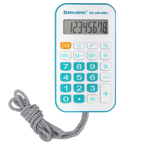 Калькулятор карманный со шнурком BRAUBERG DC-109-WBU (61x110 мм), 8 разрядов, БЕЛЫЙ/ГОЛУБОЙ, 272645